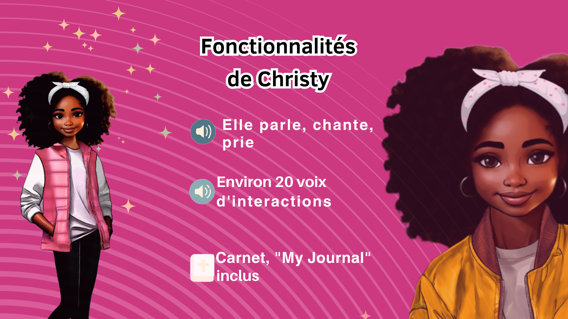 Christy n’est pas une simple poupée : elle parle, chante des louanges et accompagne les enfants avec des messages positifs et inspirants, dans un univers rempli de douceur et de foi.